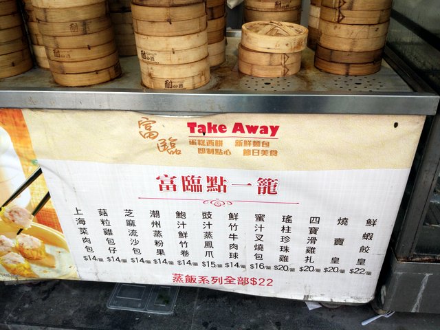 Here's another dim sum menu, sort of. This one is especially useful because it features only 12 items from a busy upstairs restaurant that offers probably a hundred items. (I ate upstairs.) These take away selections are available for purchase on the street level; no need to go inside. My guess is they are some of the house's best sellers. This place was across the street from my Hong Kong (Wan Chai) hotel 華美粵海酒店。