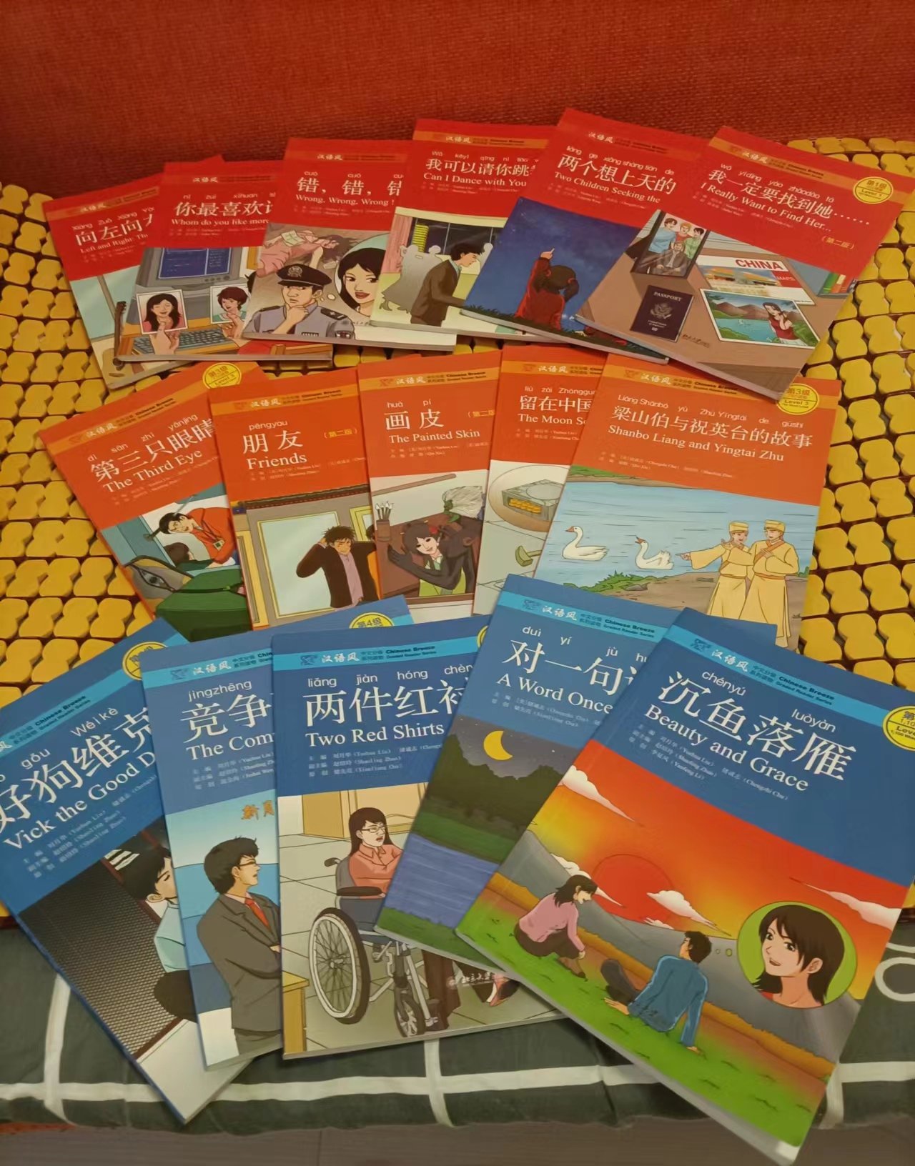 21 books in all, 4 levels. The green ones I already gave to another learner after I finished them. I have to say that although the stories are a bit cheesy, I quite enjoyed reading most of them. There is no question that they are excellent practice for Hanzi, vocab, grammar, listening and even some culture. Also love the illustrations! I'm going to pass them on to Chinese Forums member TaxiAsh when he visits Beijing at the end of this month.