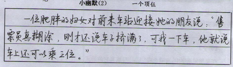 一位肥胖的妇女对前来车站迎接她的朋友说,“售票员真糊涂,刚才还说车子挤满了,可我一下车,他就说车上还可以乘三位。”