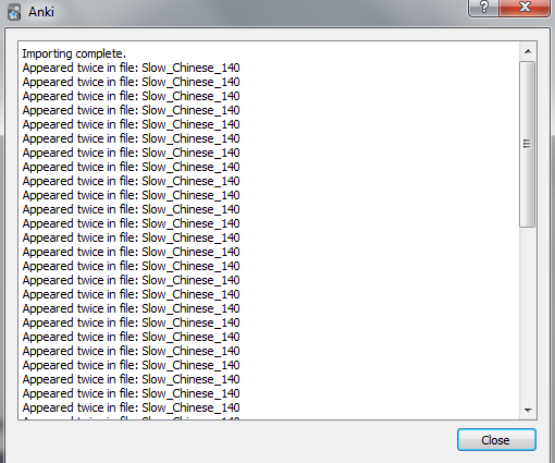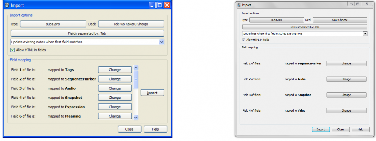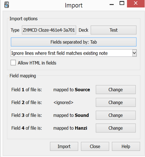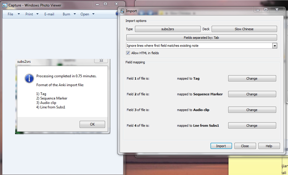 RY101 Posted May 29, 2015 at 03:50 AM Author Report Posted May 29, 2015 at 03:50 AM I successfully followed tysond's instruction on marking the timing with the existing transcription for Slow Chinese audio material. I have attached this file. Then, after downloading subs2srs, I now have the .tsv file and media folder. Importing Into Anki is the step that I am stuck on now. http://subs2srs.sourceforge.net/#importing_into_anki2 I suspect that the Field Mapping step is faulty. Take a look at the attachment file named abc. Left is the sample from the subs2srs usage page and right is what I have. Then, not knowing what or how to fix, I clicked import and ended up with only 2 cards. The very last step of Importing into Anki clearly states that I may delete the placeholder card. So I don't worry about this. But, the only card remaining shows not what I want to see. Moreover, I intend on using the Recognition format of the Chinese Support plugin for Anki. https://github.com/ttempe/chinese-support-addon/wiki So, how do I format the Field Mapping so that it's identical to the Recognition format and how would this affect the placement of media files, the recording extracted from the Slow Chinese recording split into small parts? Slow_Chinese_140.srt 1 Quote