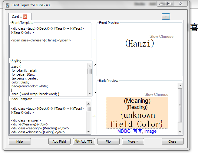 RY101 Posted May 30, 2015 at 11:55 AM Author Report Posted May 30, 2015 at 11:55 AM So I finally got 49 cards after importing with correct field mapping settings. Now, I want the cards to look like the "recognition" format. https://github.com/t...port-addon/wiki Assuming that the Card Types for the sub2srs should be the same as the Chinese(advanced), the one for"recognition" format, I copied and pasted everything in the Front Template, Styling, Back Template, from the latter to the first. Then, my cards look like... not what I want to see. It's missing pinyin and the meaning field. Quote