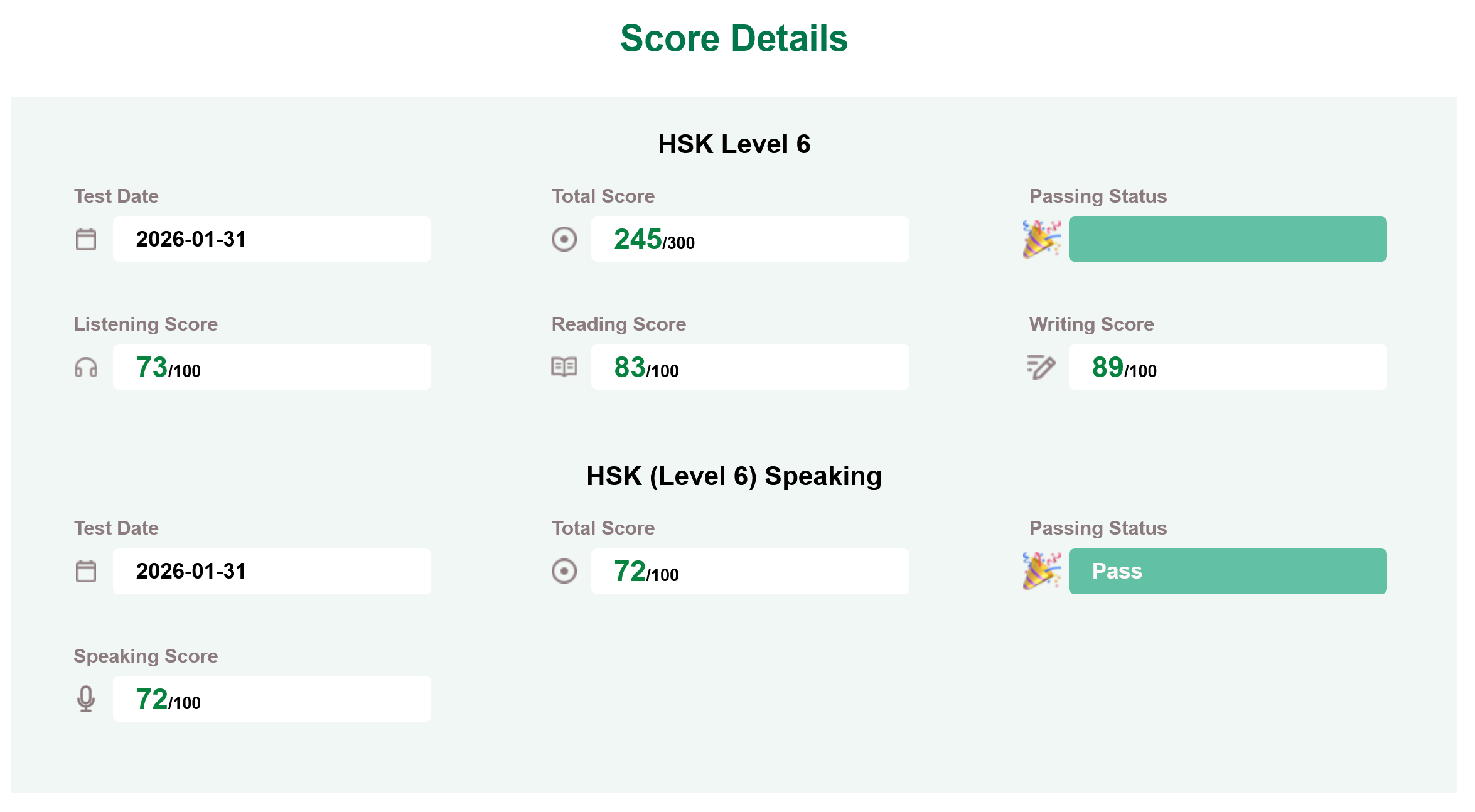16. The HSK 3.0 trial exam results came out today. These are my HSK6 marks: Obviously, I'm absolutely thrilled with how things turned out. I note that a 240 on the HSK6 officially corresponds to a HSK7 (source) :