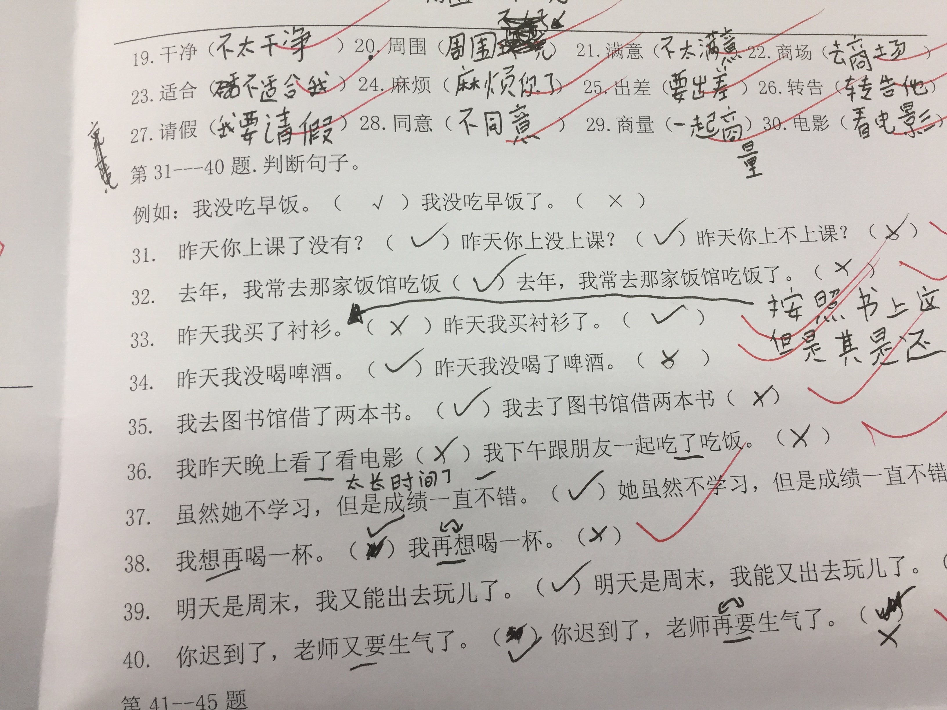 昨天我买了衬衫 - This one was difficult, because our book (using the exact same sentence) teaches that this is basically incorrect, and you only put 了 immediately after the verb if you have more than a single object following it.  So it would have to be 昨天我买了一件衬衫。However, I know that in reality this construction is actually fine, so I marked it incorrect and then put a note next to it.  Not really sure why our book says this sentence is incorrect.