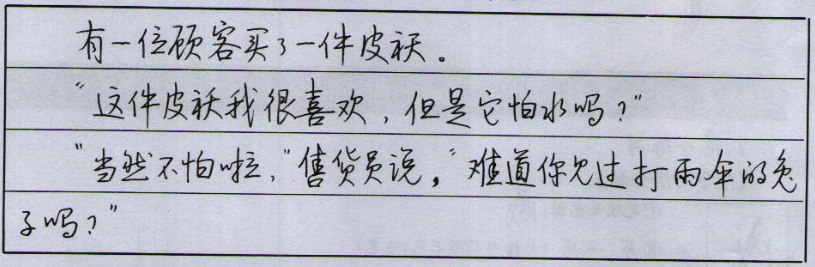 “这件皮袄我很喜欢,但是它怕水吗?”