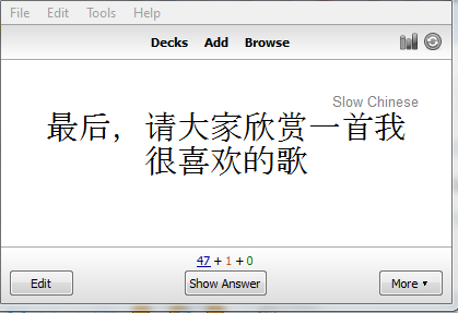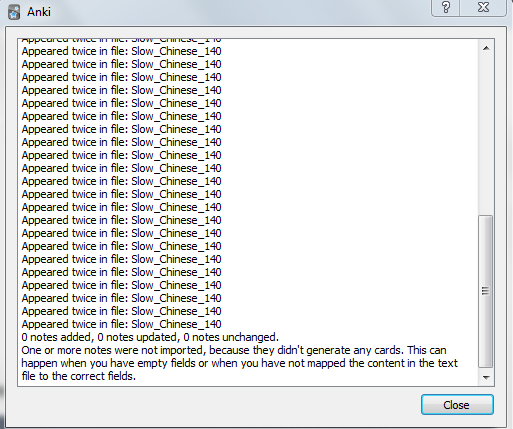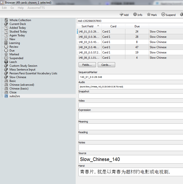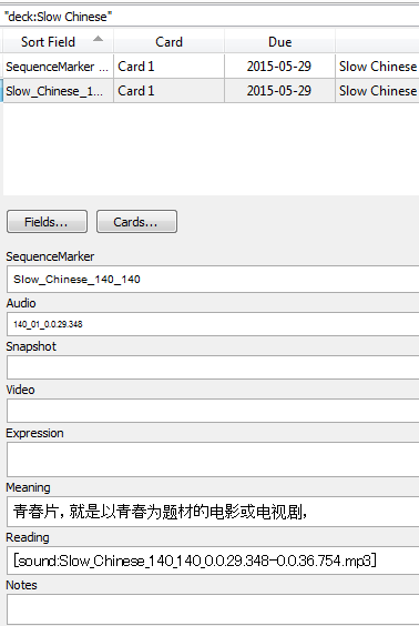 RY101 Posted May 29, 2015 at 03:50 AM Author Report Posted May 29, 2015 at 03:50 AM I successfully followed tysond's instruction on marking the timing with the existing transcription for Slow Chinese audio material. I have attached this file. Then, after downloading subs2srs, I now have the .tsv file and media folder. Importing Into Anki is the step that I am stuck on now. http://subs2srs.sourceforge.net/#importing_into_anki2 I suspect that the Field Mapping step is faulty. Take a look at the attachment file named abc. Left is the sample from the subs2srs usage page and right is what I have. Then, not knowing what or how to fix, I clicked import and ended up with only 2 cards. The very last step of Importing into Anki clearly states that I may delete the placeholder card. So I don't worry about this. But, the only card remaining shows not what I want to see. Moreover, I intend on using the Recognition format of the Chinese Support plugin for Anki. https://github.com/ttempe/chinese-support-addon/wiki So, how do I format the Field Mapping so that it's identical to the Recognition format and how would this affect the placement of media files, the recording extracted from the Slow Chinese recording split into small parts? Slow_Chinese_140.srt 1 Quote