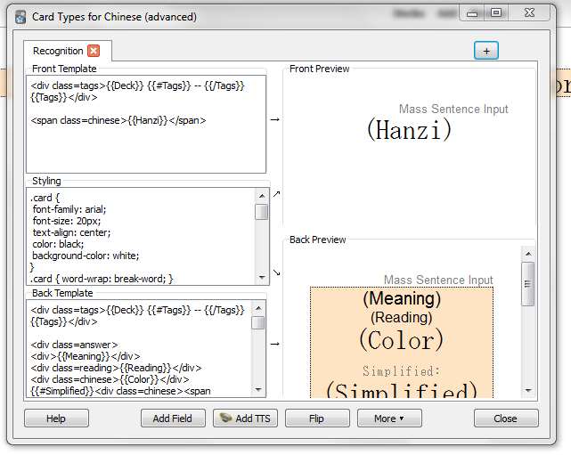 RY101 Posted May 30, 2015 at 11:55 AM Author Report Posted May 30, 2015 at 11:55 AM So I finally got 49 cards after importing with correct field mapping settings. Now, I want the cards to look like the "recognition" format. https://github.com/t...port-addon/wiki Assuming that the Card Types for the sub2srs should be the same as the Chinese(advanced), the one for"recognition" format, I copied and pasted everything in the Front Template, Styling, Back Template, from the latter to the first. Then, my cards look like... not what I want to see. It's missing pinyin and the meaning field. Quote