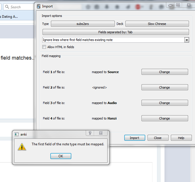 crt32 Posted May 30, 2015 at 08:58 AM Report Posted May 30, 2015 at 08:58 AM Set the second field to SequenceMarker (you set it to <ignored>), just as subs2srs told you to do. Even if you won't use this field in the future, Anki needs it as sort of unique identifier. Quote