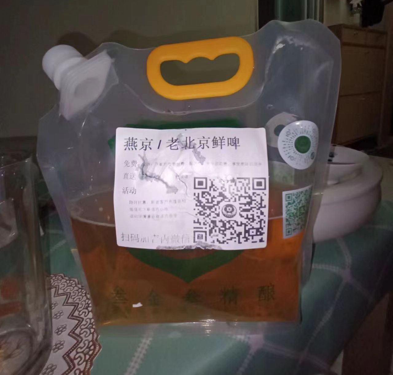 This summer I've been enjoying an extra bit of 扎啤 / draft beer. Something about draft always tastes better than bottles and I like buying local stuff. It's pretty popular in Beijing to sell these bags(or sometimes canisters) of draft beer by waimai 外卖 or walking in the shop directly. They add pressure to the bag before sealing, so it arrives fresh, bubbly and cold within about a half hour. The price is right too. 1.5 - 2 liters for around 17rmb for Beijing/qingdao draft, 35-50 for white or wheat beer, 70-100 for Ipa.